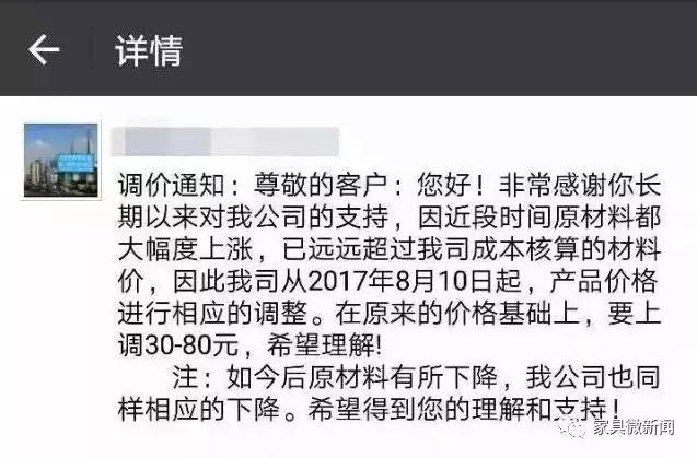 對于家具企業(yè)的漲價潮就怕只是一個開始,眾多中小家具企業(yè)將面臨原材料緊缺、環(huán)保去產(chǎn)能、外貿(mào)環(huán)境更加復(fù)雜、有實力企業(yè)提高環(huán)保設(shè)備擴產(chǎn)、資金及產(chǎn)品滯銷等六大危機,最終將引爆中小家具企業(yè)倒閉潮。下半年,不是價高價低,而是有錢不一定有貨!而且很多原材料已經(jīng)開始漲價。